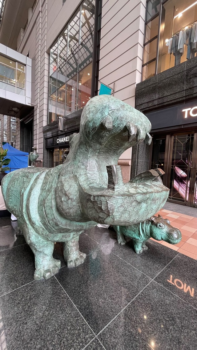 3つ目は、エルガーラ・パサージュ広場にある『カバの親子』です。福岡市出身の柴田善二さんの作品です。