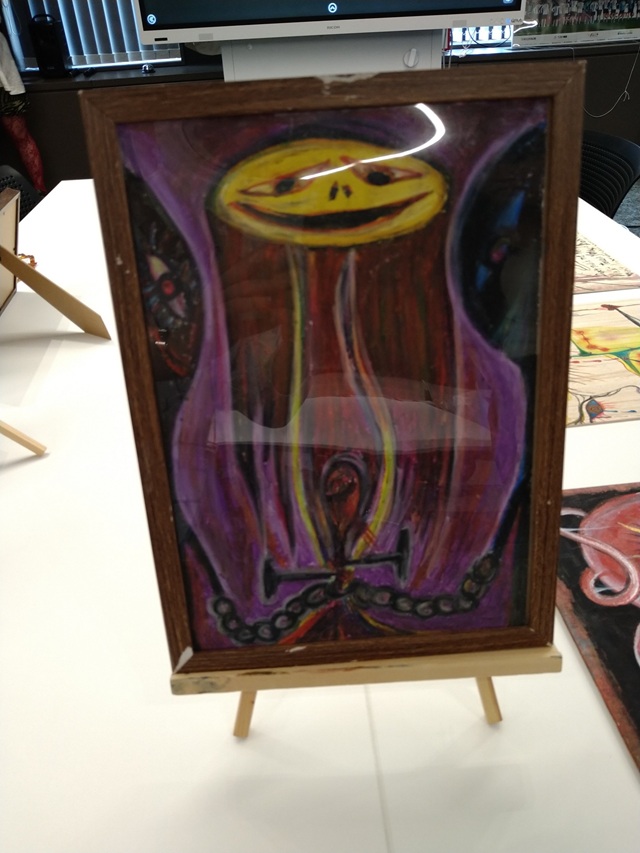 1枚目は緑色と赤色の人物がかさなっているような絵でした。私はこの絵から不安をイメージしました。人とのつながりを求めているけれど、それに対して傷つくのではないかという不安定さをかさなっているところの顔の表情から感じたからです。