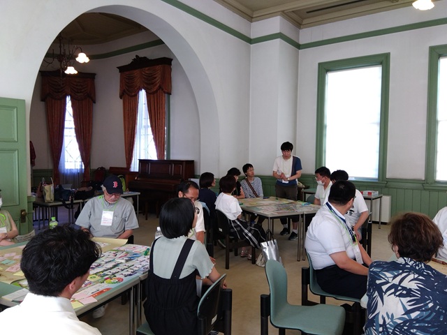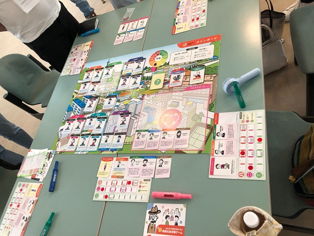 机の上には今回の行うゲーム「コミュニティコーピング」の道具が置かれています。町のイラストが描かれたボード、人のイラストが書かれたカード。参加者の方々は興味津々です。