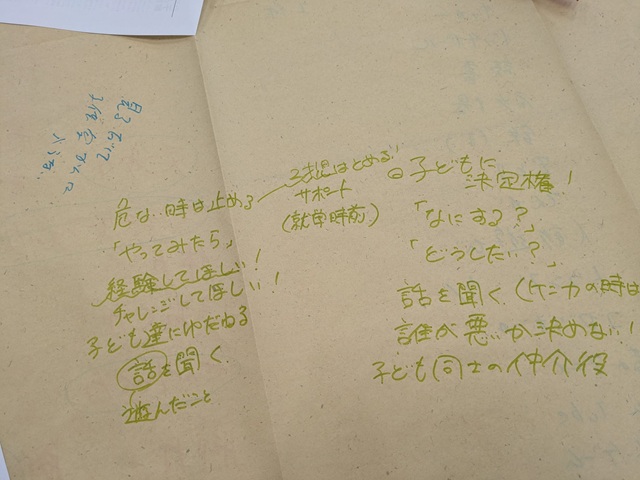 続いて、私たちが小さい頃にしていた遊びを思い出しながら、今の子どもたちの遊びと比較しました。私たちの時代は、外で身体を使って遊ぶことが主流でしたが、今はゲームやネットを使った遊びが増えています。それでも、遊びを通して学べることの本質は変わらないと感じました。特に、身体を使った遊びは、子どもたちの健やかな成長にとって非常に重要だと実感しました。